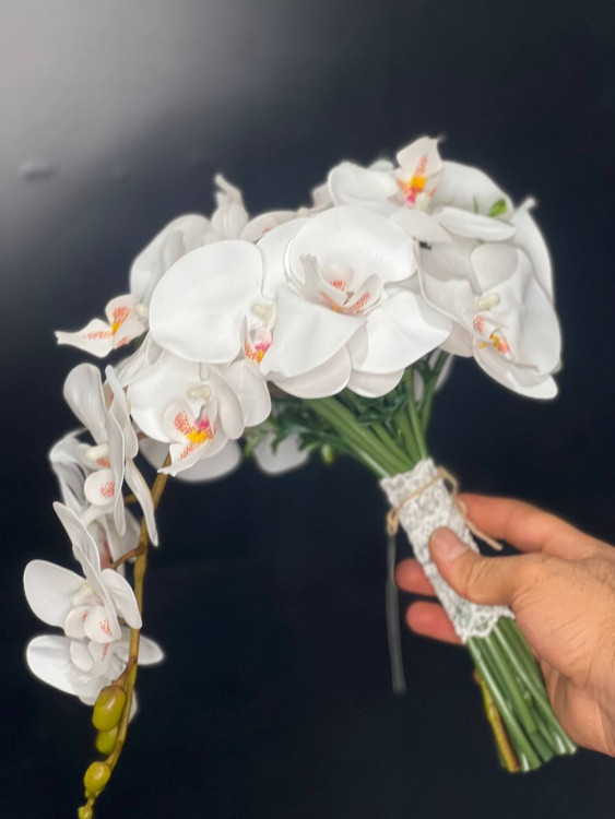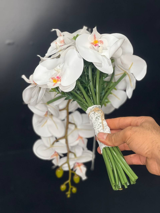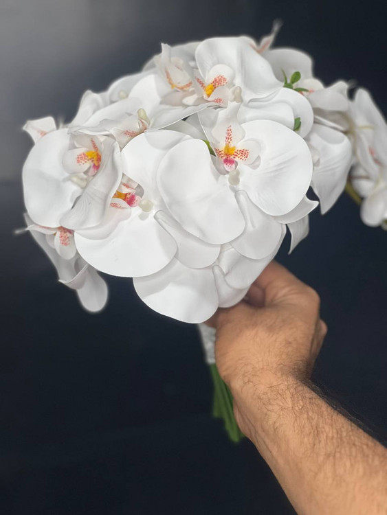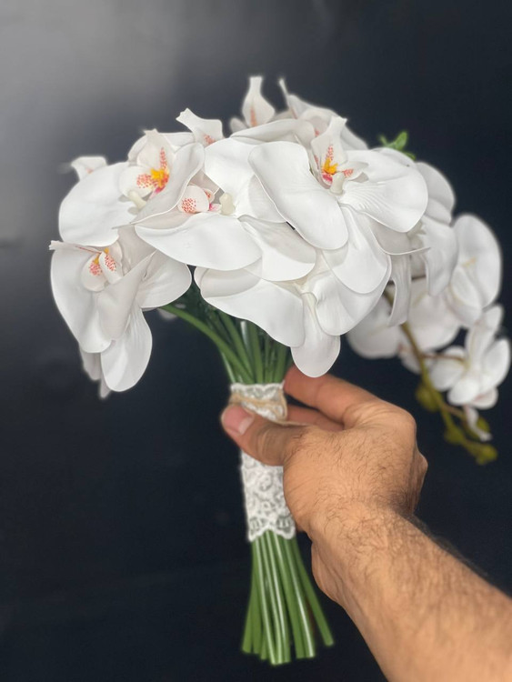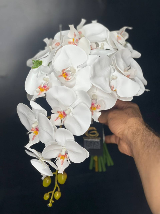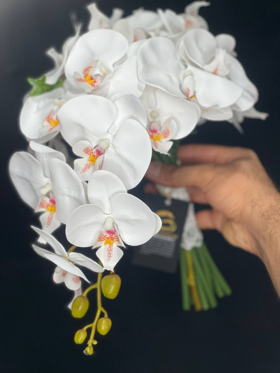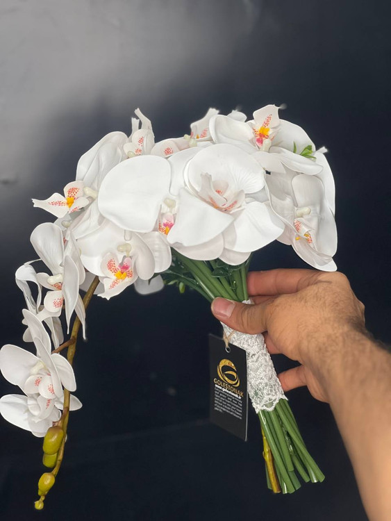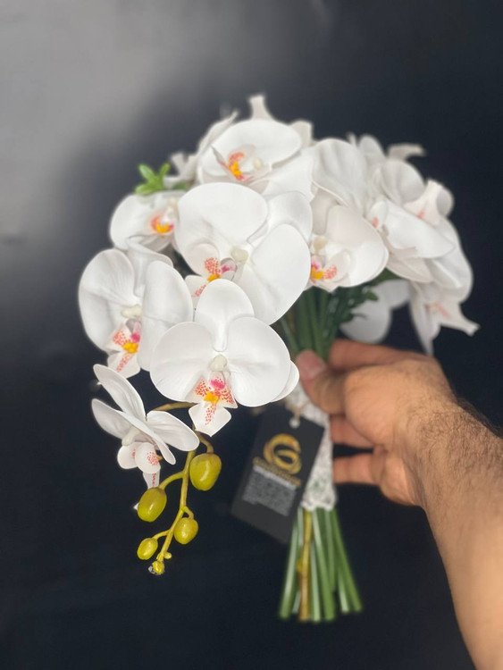 این دسته گل عروس زیبا از گل ارکیده سفید لمسی مصنوعی درست شده.