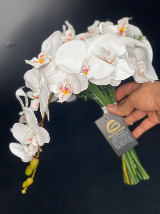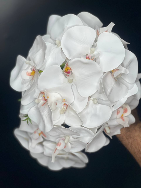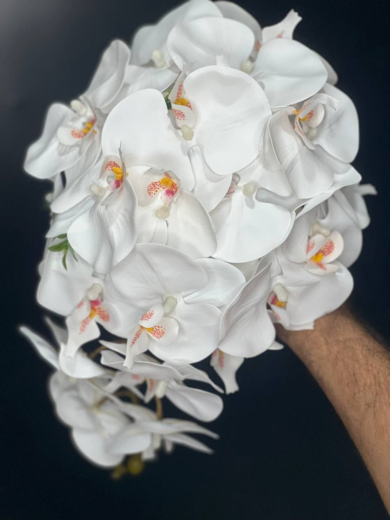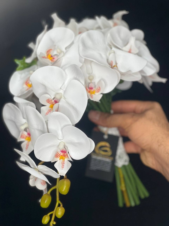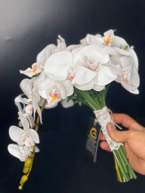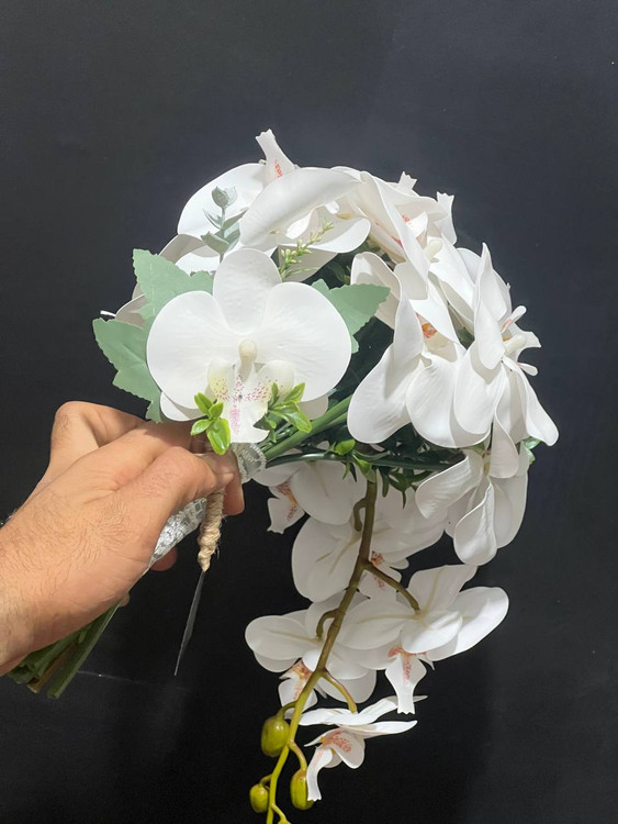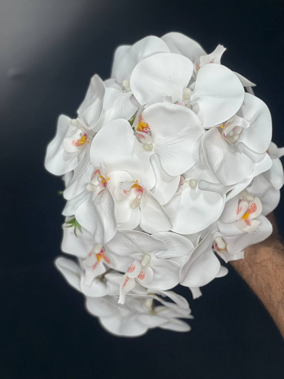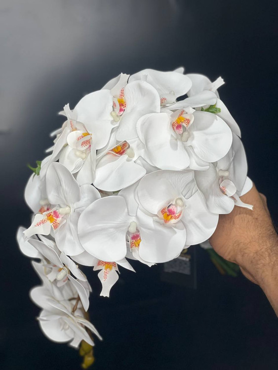 این دسته گل عروس زیبا از گل ارکیده سفید لمسی مصنوعی درست شده.