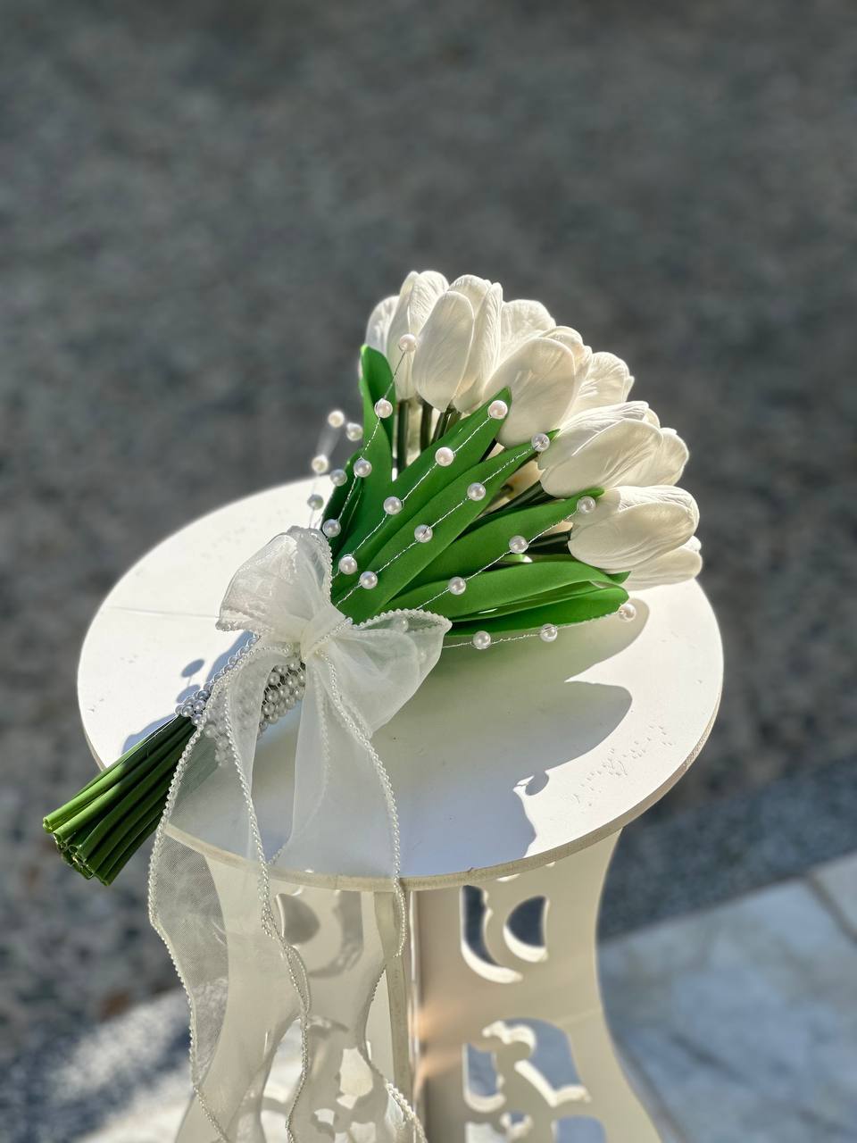 🌿دسته گل لاله سفید ۲۰ شاخه(بدون تغییر رنگ و ثابت) دیزاین برگ سبز مرواریدی و پاپیون لبه مروارید +گل کت داماد