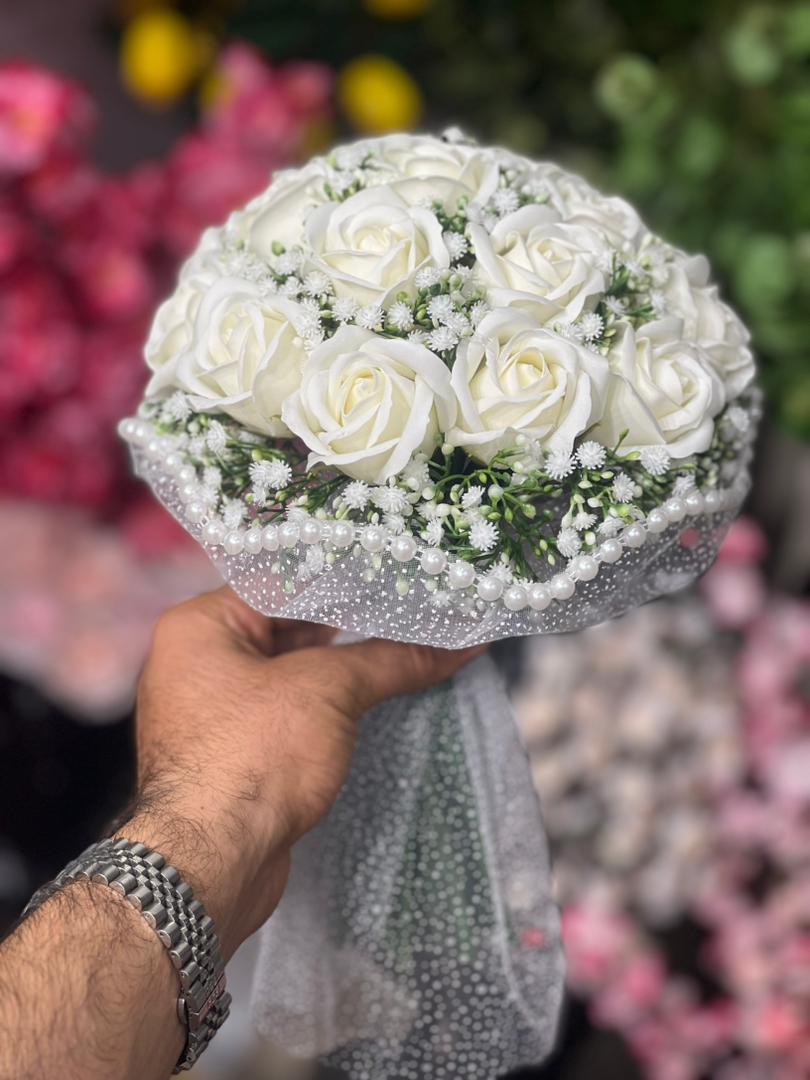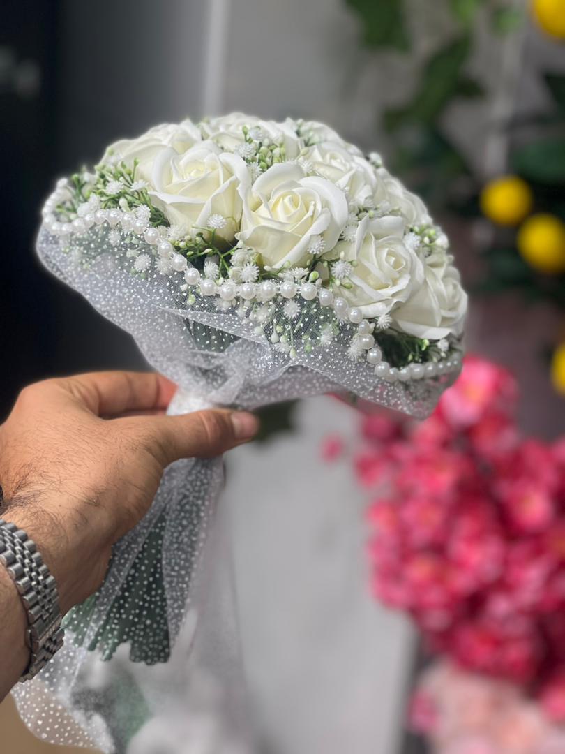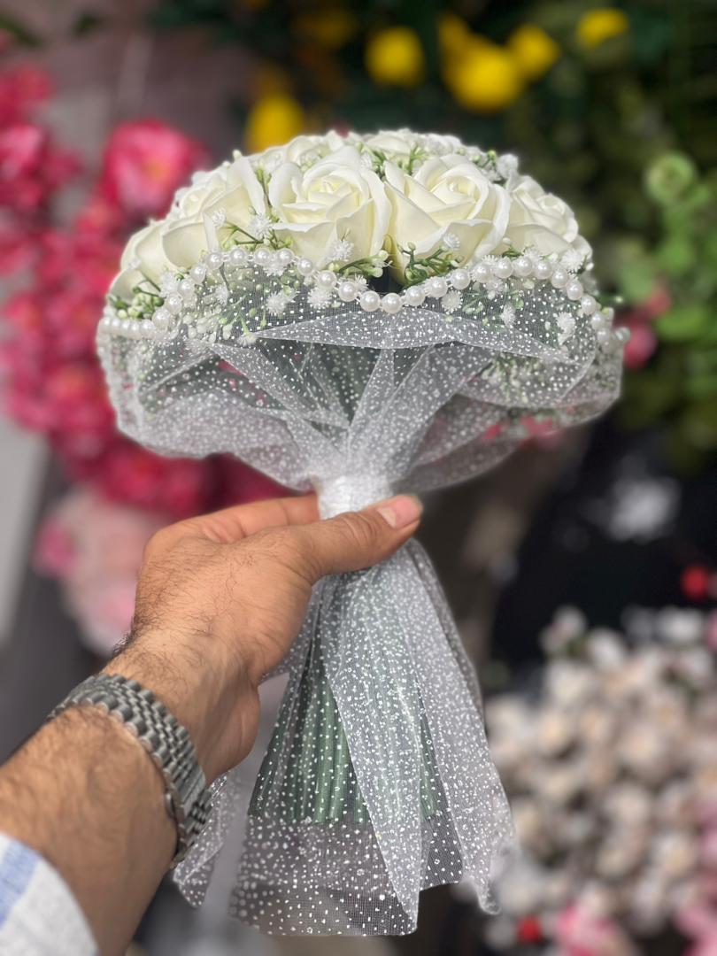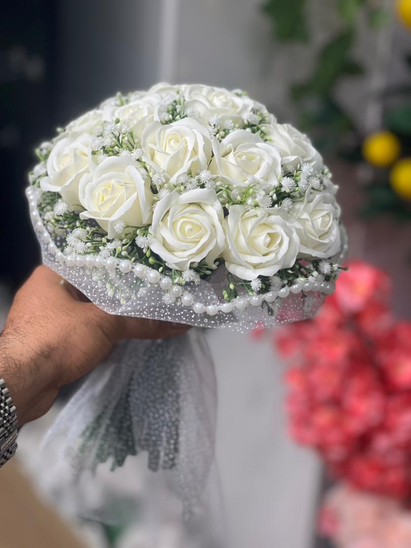 دسته گل رز عروس رز صابونی18شاخه با تور برفی