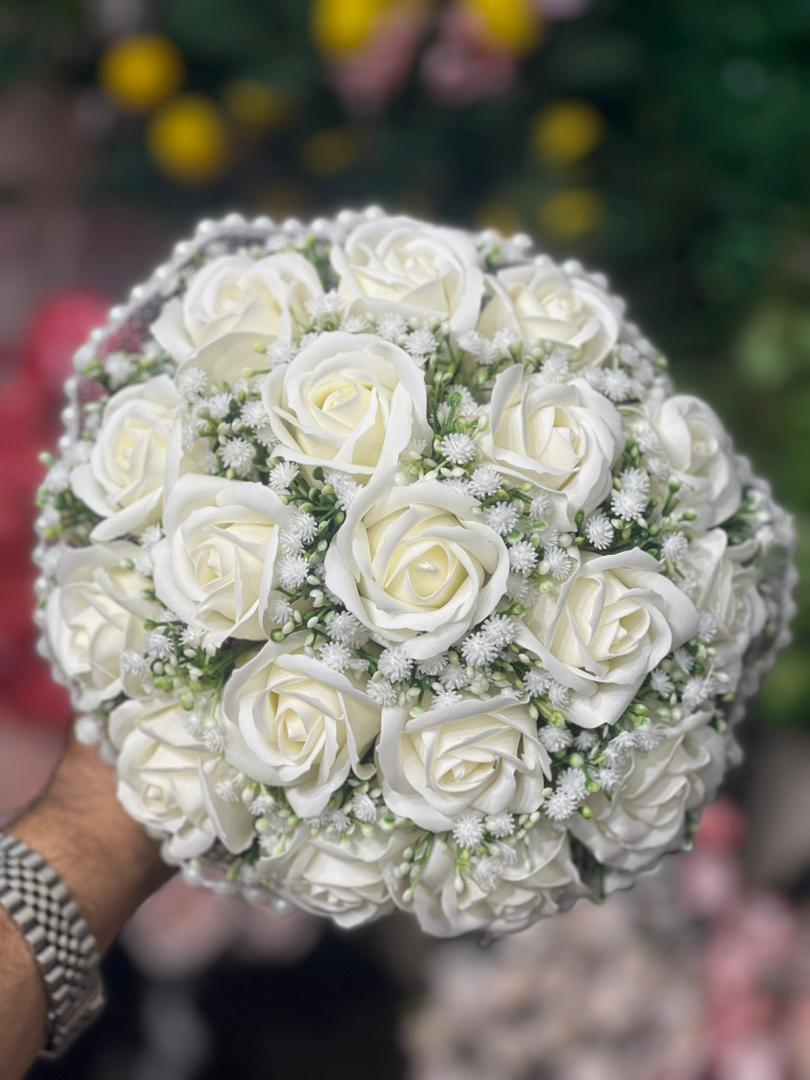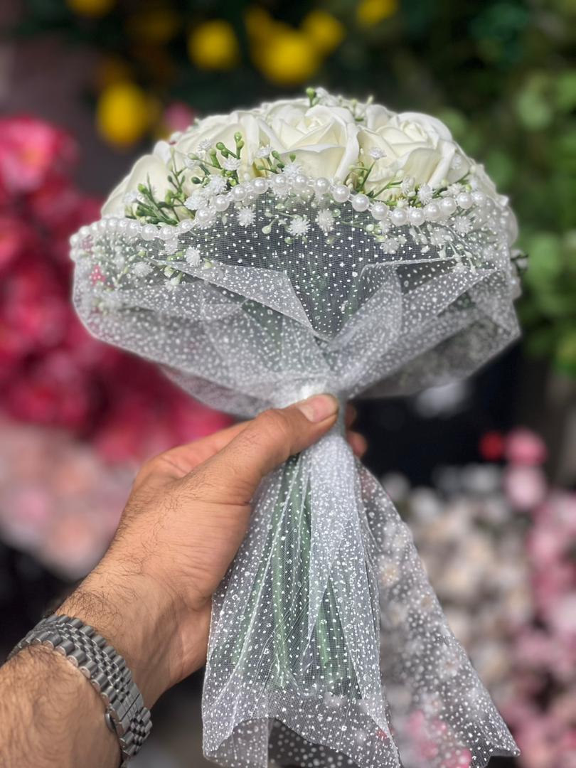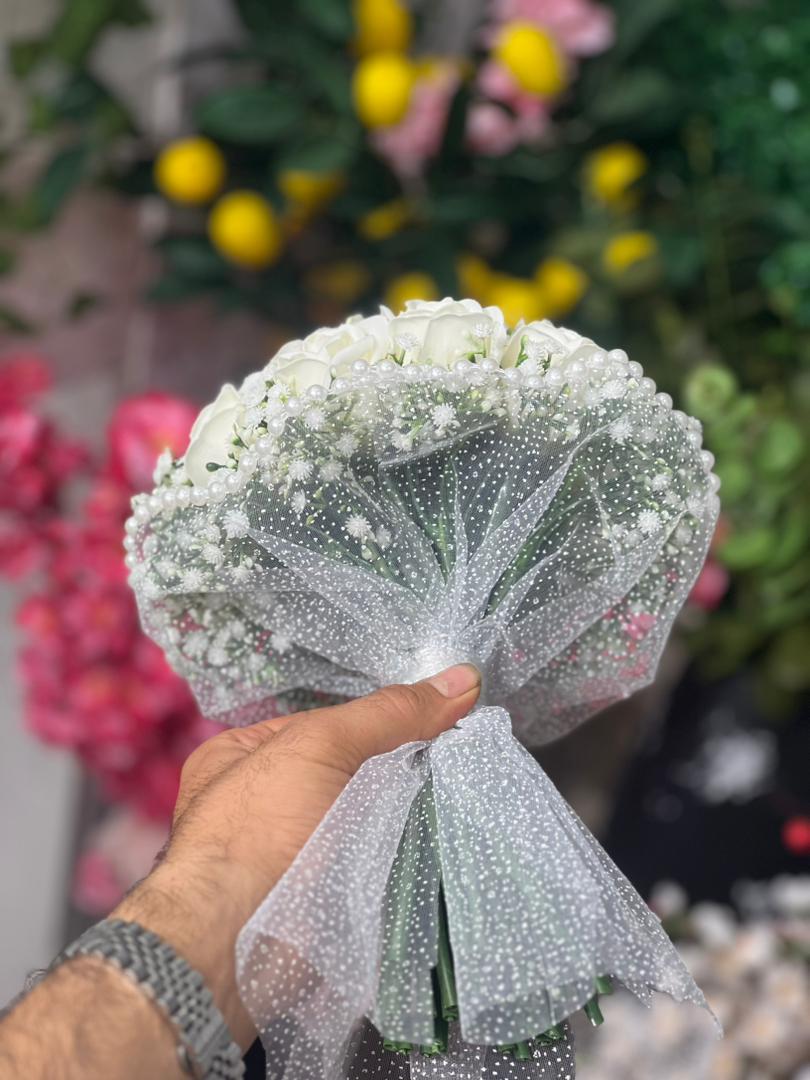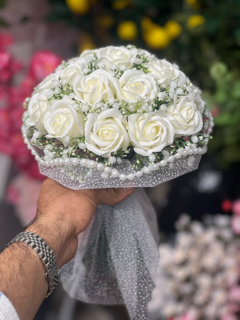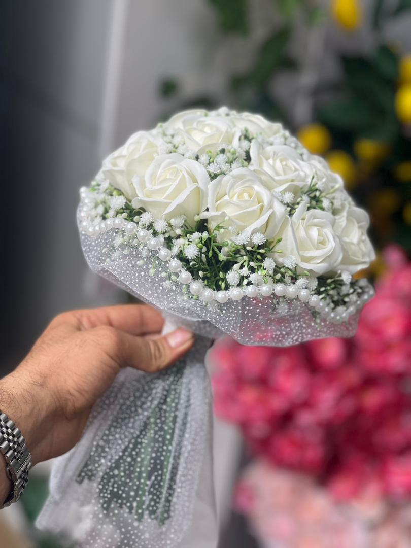 دسته گل رز عروس رز صابونی18شاخه با تور برفی
