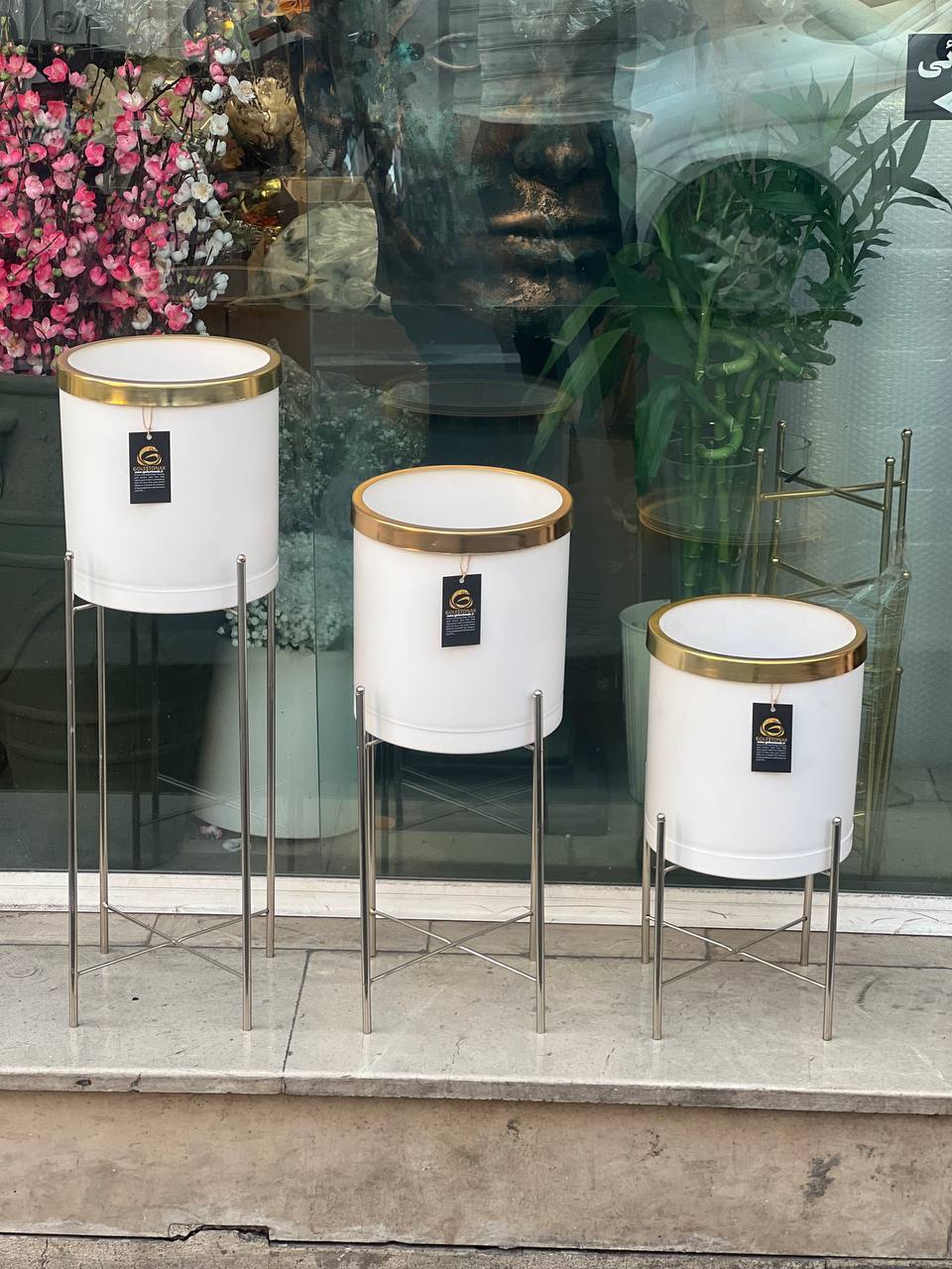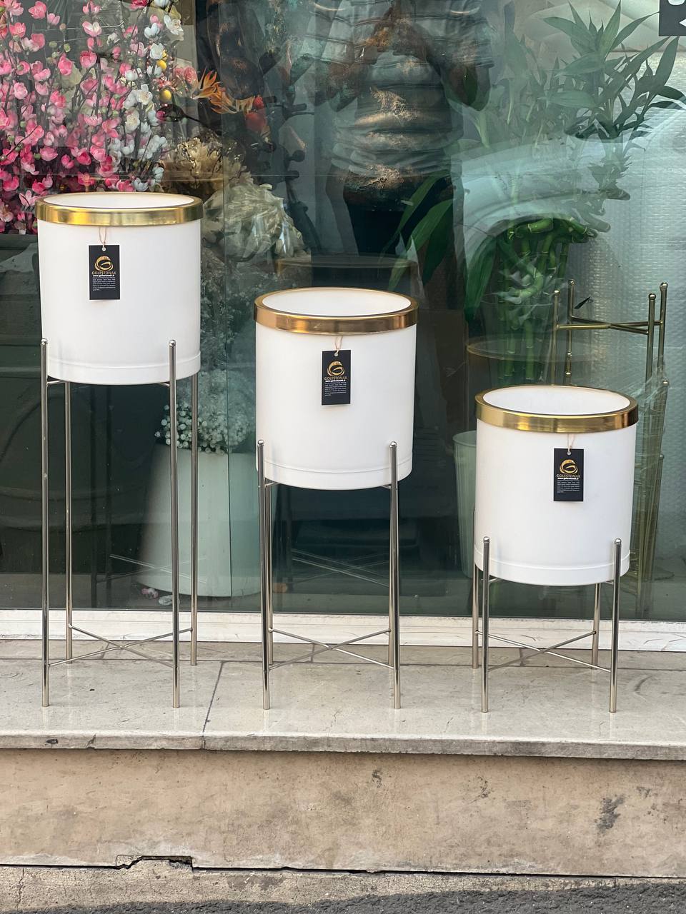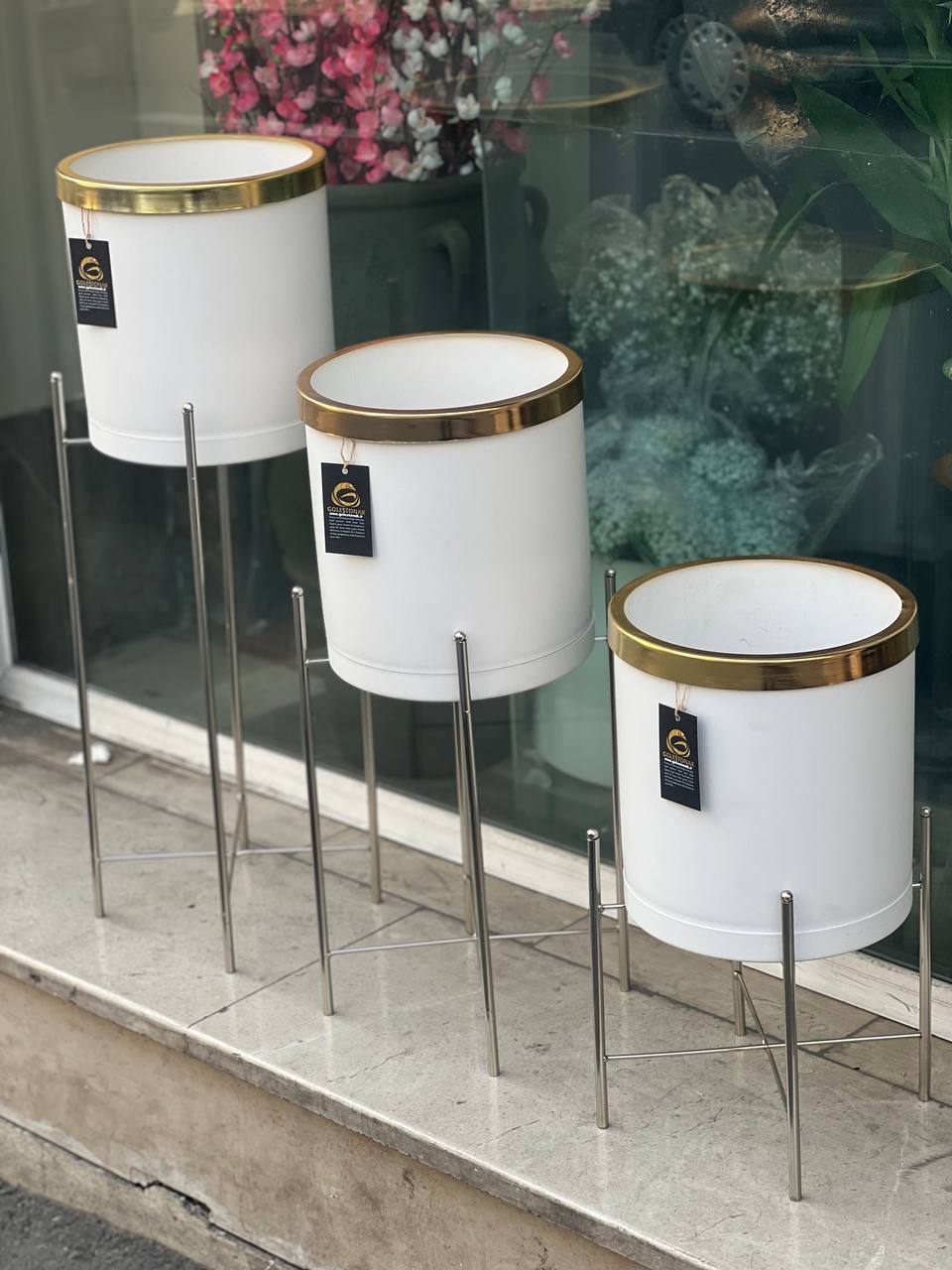 استند3تایی نقره ای با گلدان پلیمری(سفید) و حلقه طلایی دهنه25