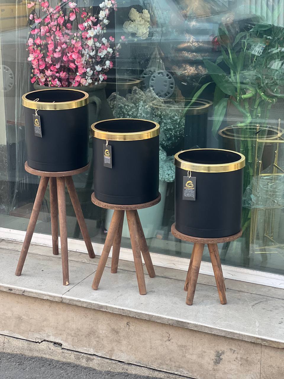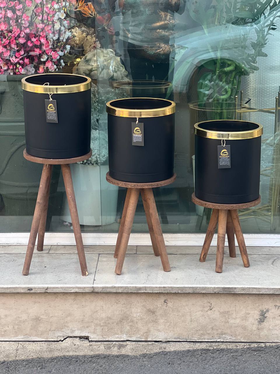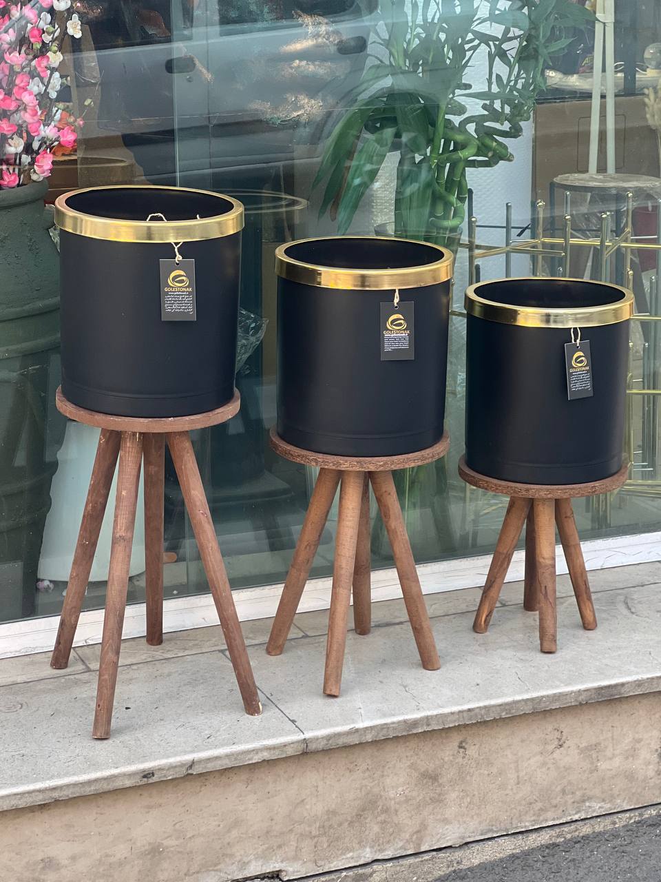 استند چوبی ۳عددی با گلدان پلیمری مشکی دهنه۲۵