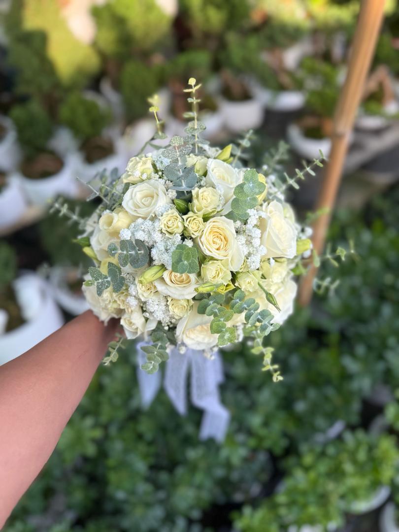 دسته گل عروس طبیعی مدل رز و اکالیپتوس