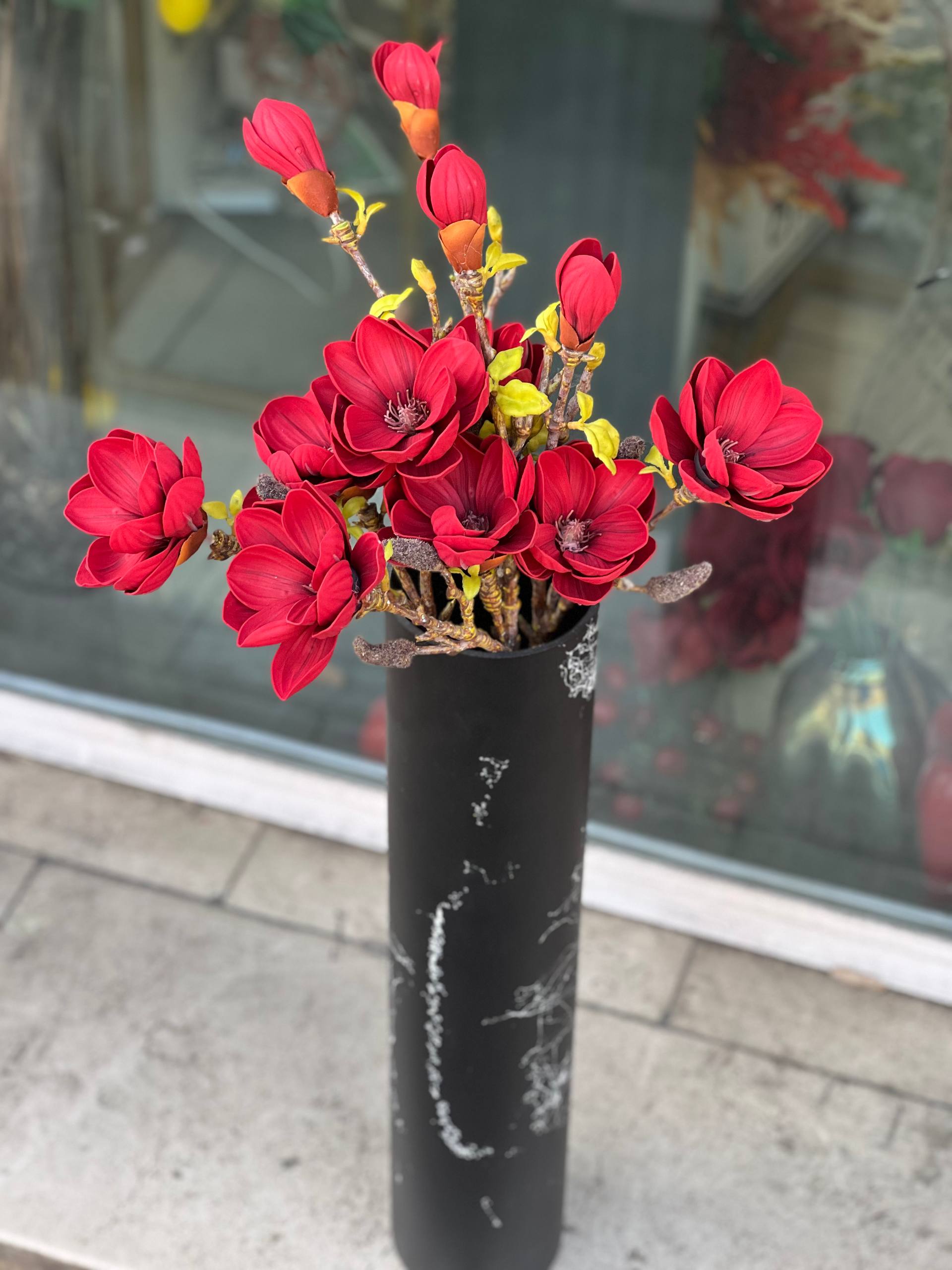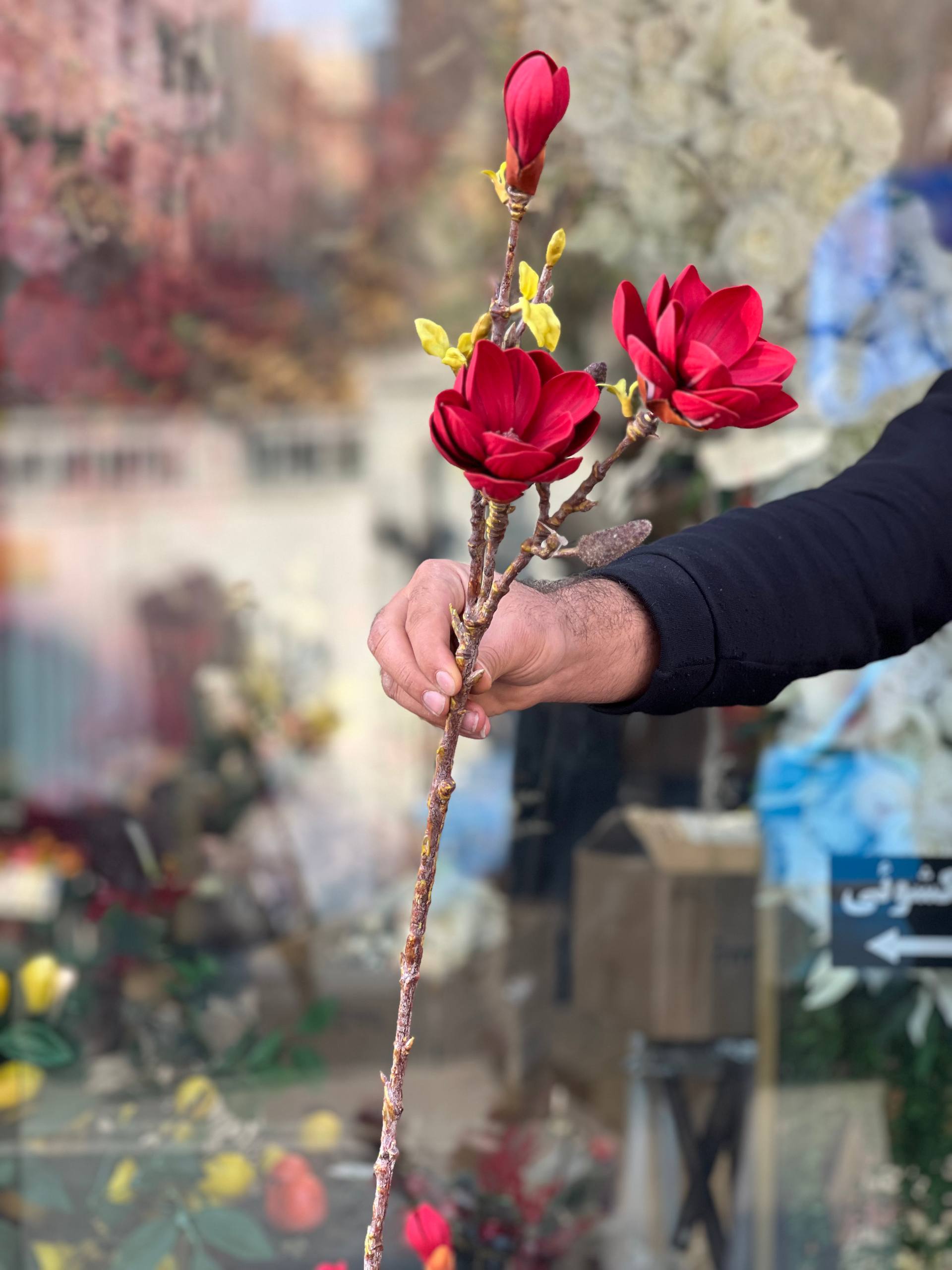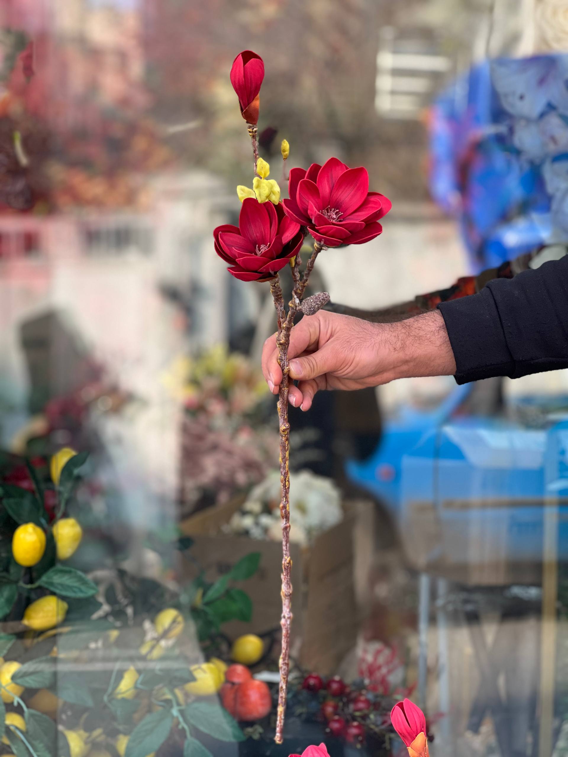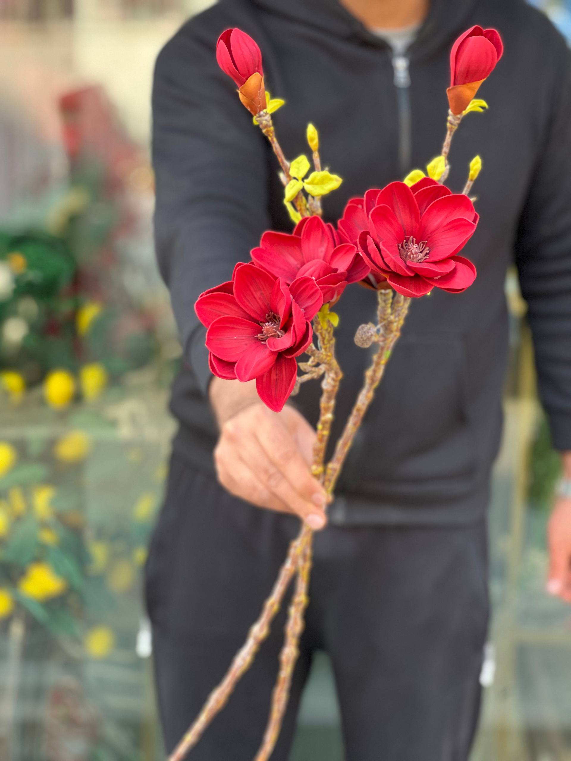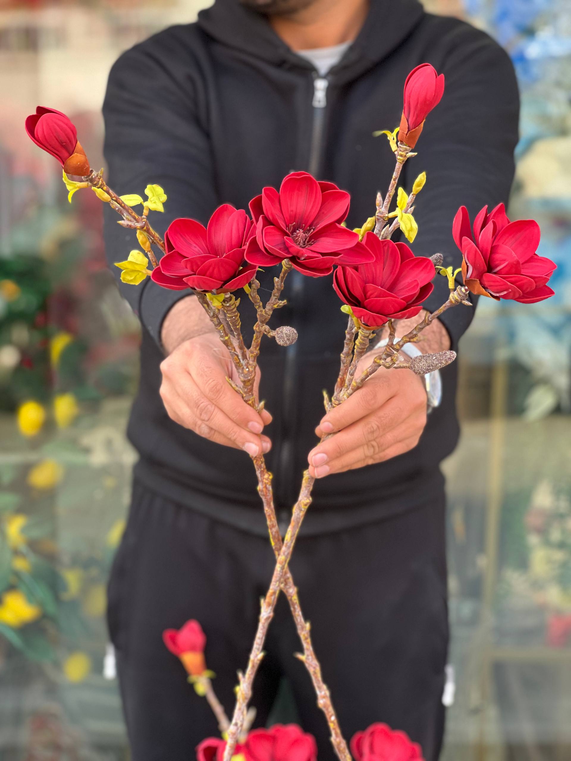 گل مصنوعی شاخه ای مگنولیا زرشکی ۲گل و یک غنچه