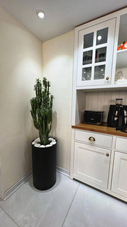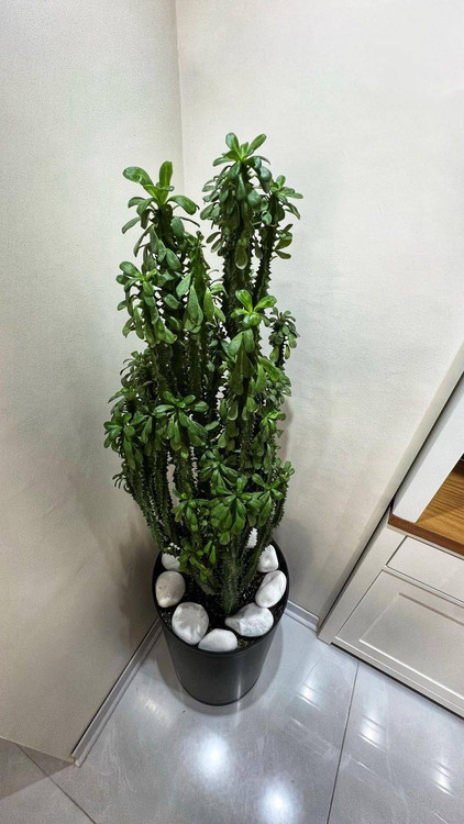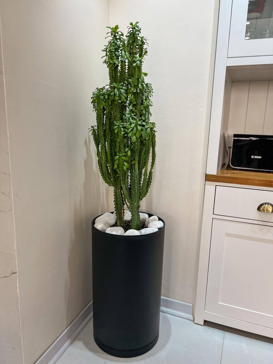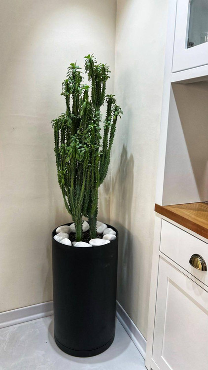 کاکتوس افوربیا بزرگ با گلدان پلیمری مشکی و قلوه سنگ سفید