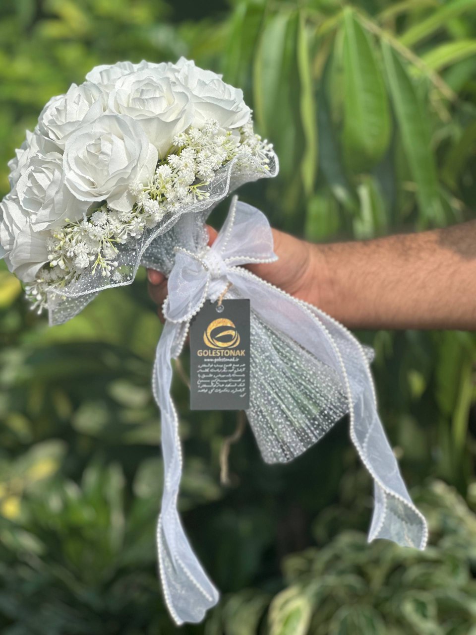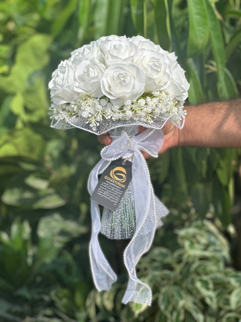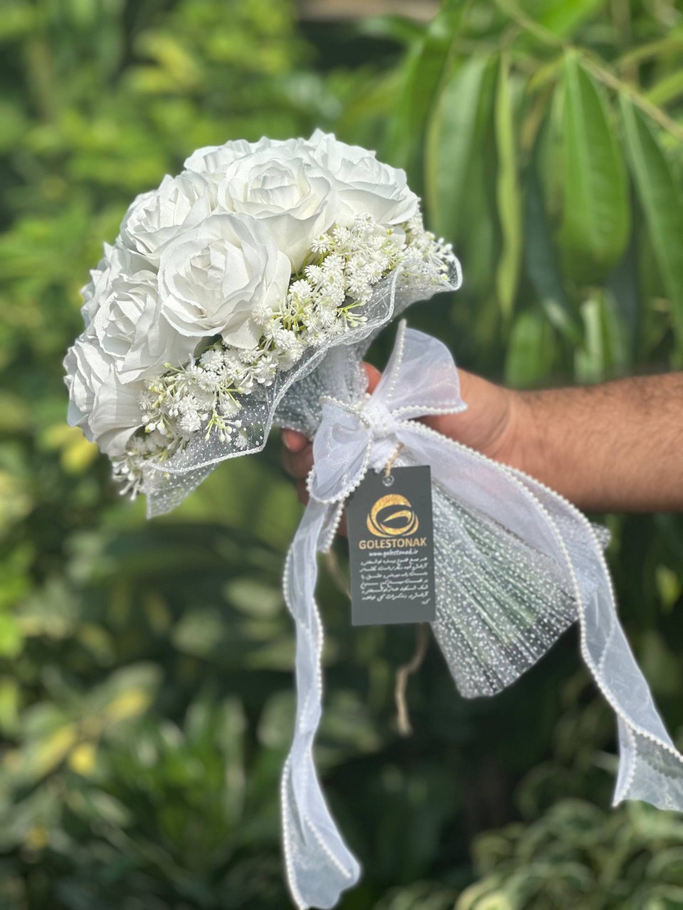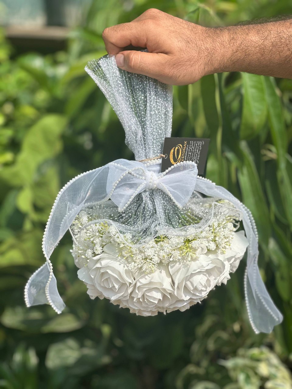 دسته گل عروس مدل گرد رز و ژیپسوفیلا با ربان مروارید(سبز کمرنگ)