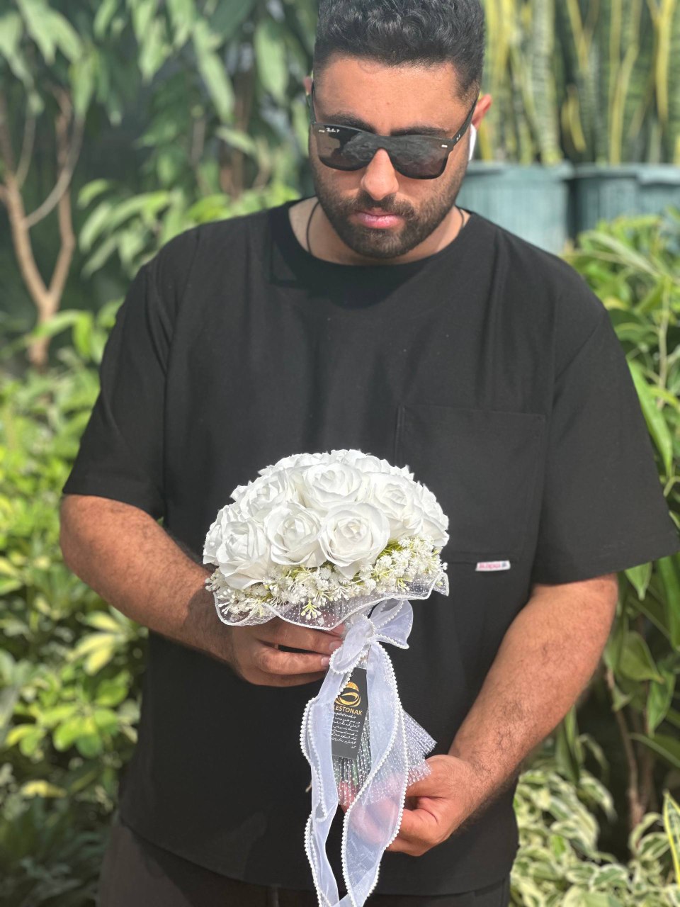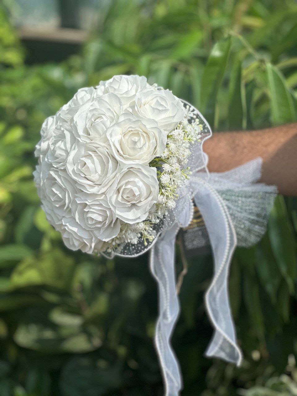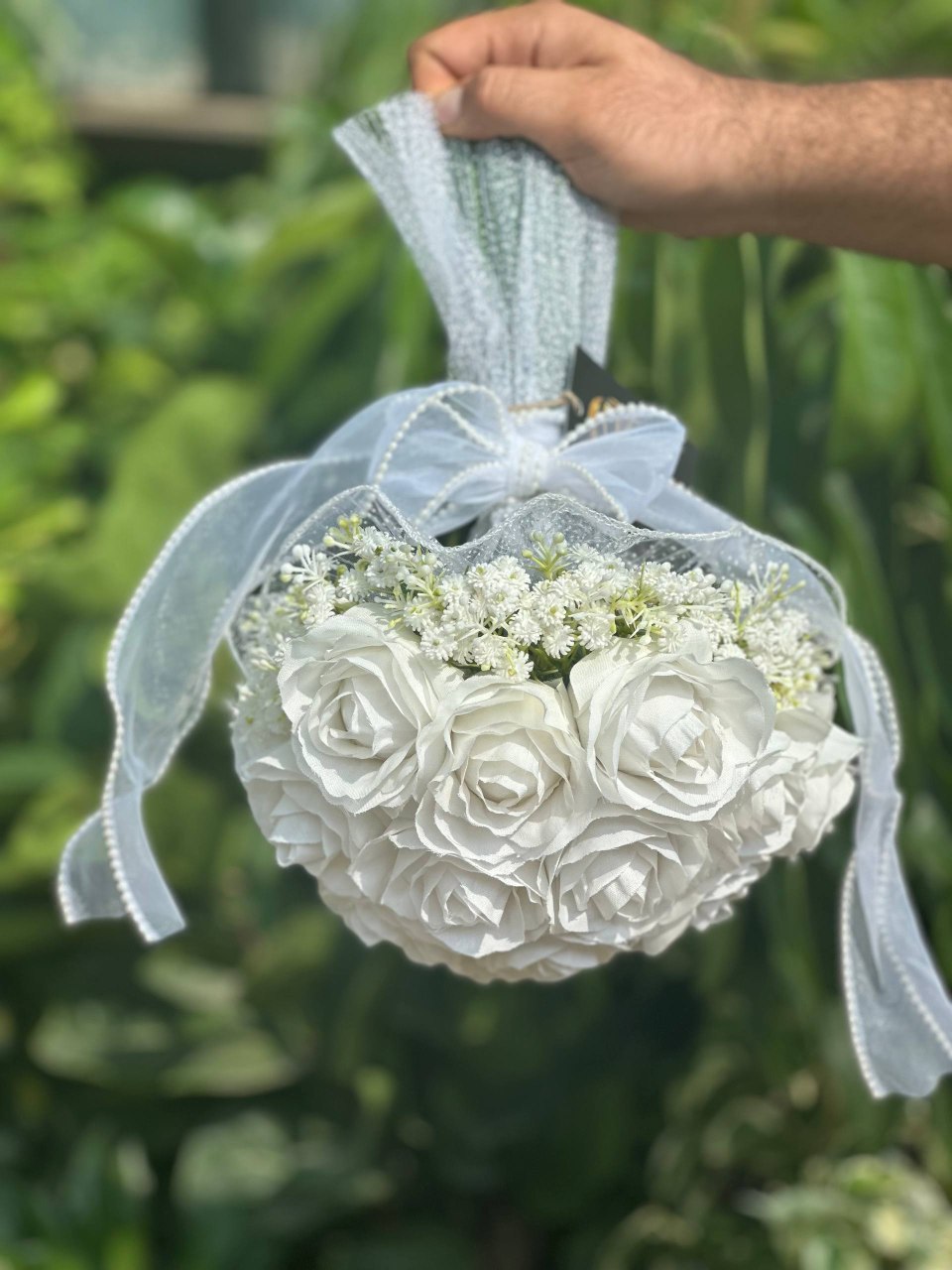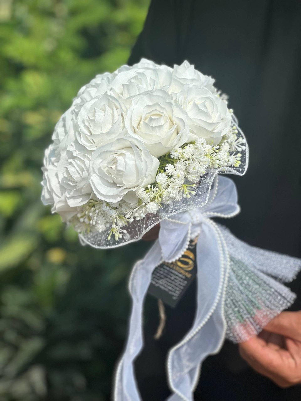 دسته گل عروس مدل گرد رز و ژیپسوفیلا با ربان مروارید(سبز کمرنگ)