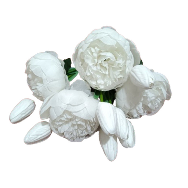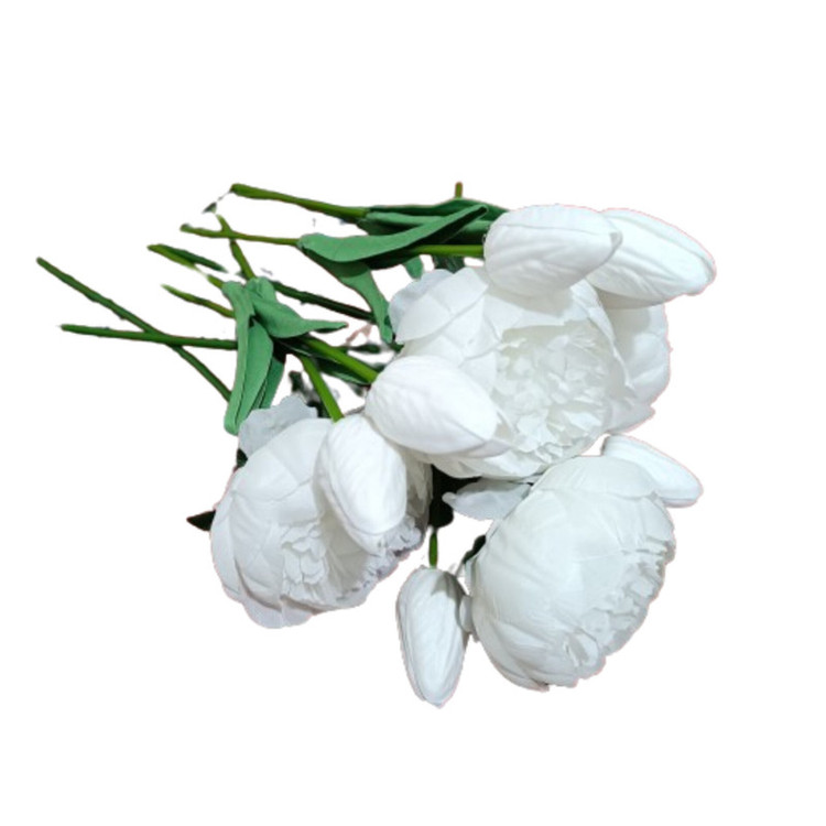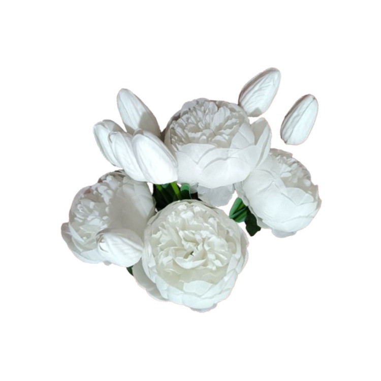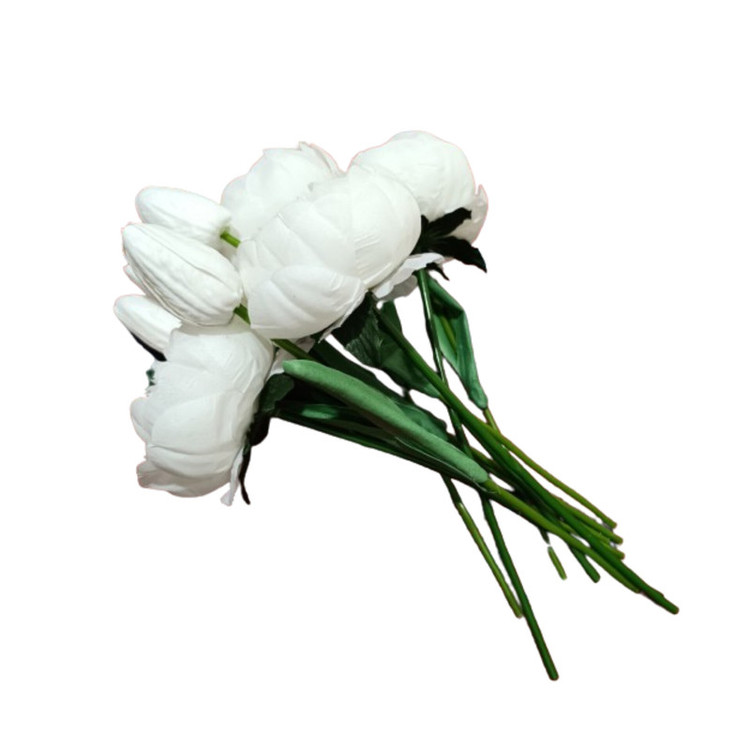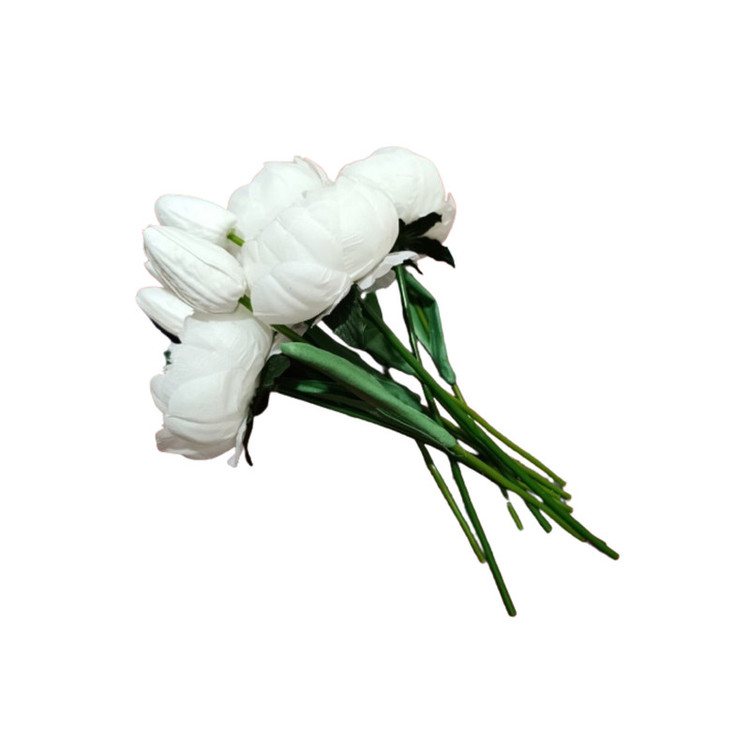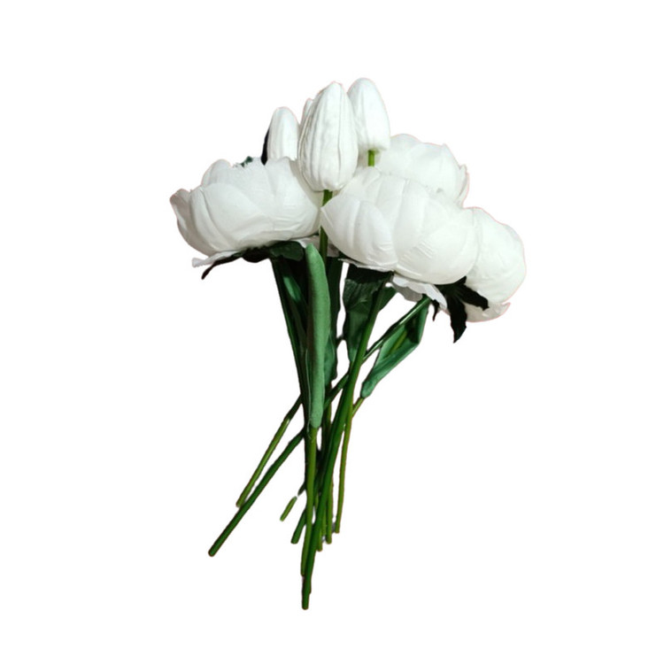 این دسته گل شامل ۷ شاخه لاله فومی مصنوعی و ۴ شاخه پیونی سفید بزرگ میباشد. شما میتوانید به میل خود این ۱۱ شاخه گل را در گلدان شیشه ای تزئین کنید. کیفیت گل ها در این دسته گل فوق العاده بالا میباشد و از گل های درجه یک استفاده شده است.